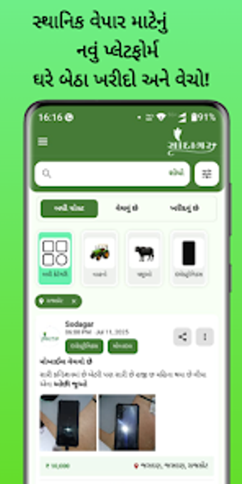 Sodagar, Gujarat pazarında yerel alım satım için tasarlanmış, basit ve hızlı bir uygulamadır. Kullanıcılar, bisiklet, cep telefonu veya hayvan gibi ürünlerini satmak için doğrudan alıcılarla bağlantı kurabilir. Uygulama, komisyon veya aracı olmadan işlem yapmayı sağlar. Gujarati dilini desteklemesi, yerel pazara hitap etmesini kolaylaştırır. Kullanıcılar, yalnızca ürün adı, fiyat, konum ve fotoğraflarını ekleyerek ilan oluşturabilirler.
